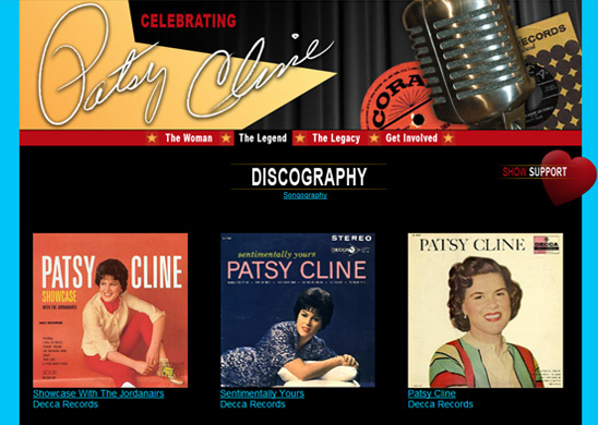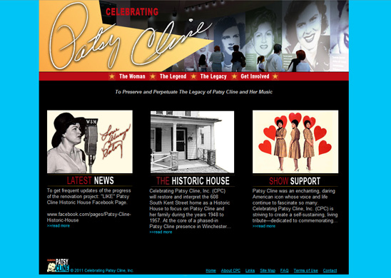 Celebrating Patsy Cline, a volunteer organization, wanted to create a website to commemorate Patsy Cline and to spread awareness of their future Patsy Cline museum. This was the very first project I worked on at Media Box Studios. It was fun to be able to play with vintage ideas and retro colors - don't you love that electric blue?