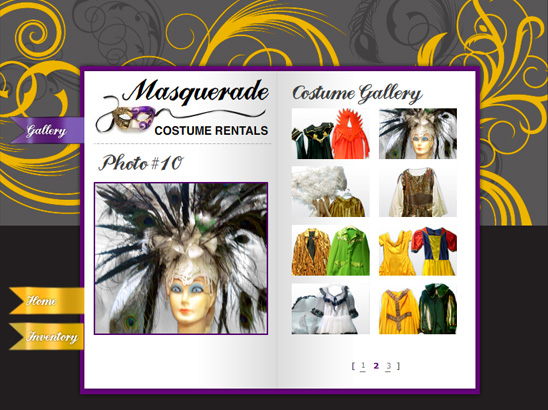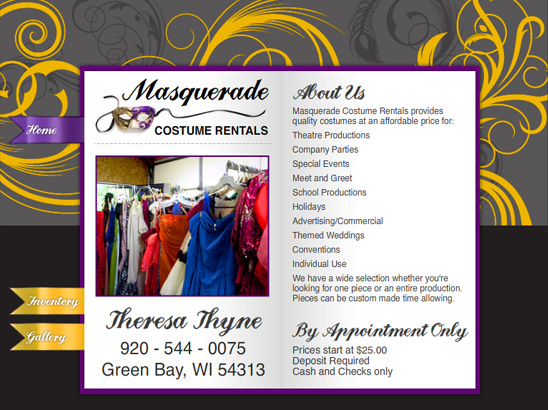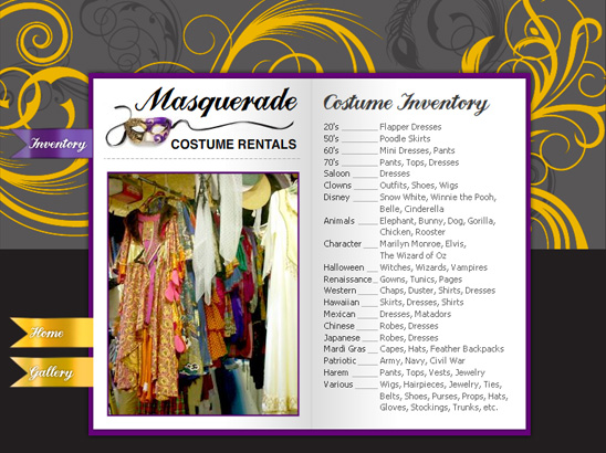 My aunt asked me to create her first ever website for her costume rental company, Masquerade Entertainment. Due to my own time restraints, the easiest solution to help deliver my aunt a lively flash website was to start with a template and customize it. Many of the photos she provided of her costumes were poorly lit, blurry, and surrounded by other items. I did my best to color correct the images and drown out the surrounding imagery competing with the subject. My aunt was thrilled to be able to showcase some of her favorite costumes she created and to finally have an online presence.