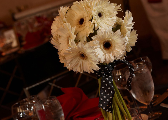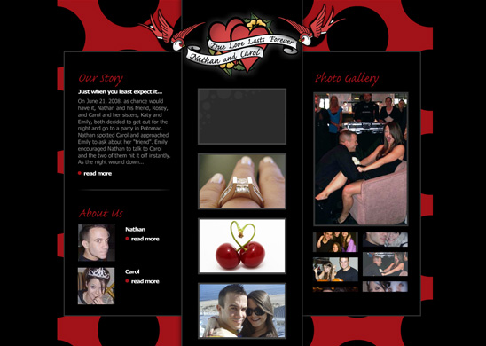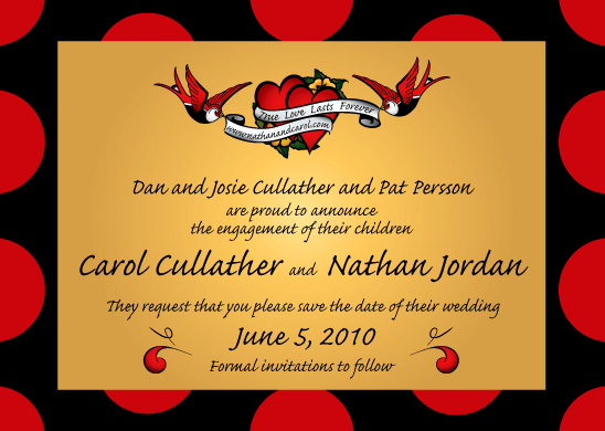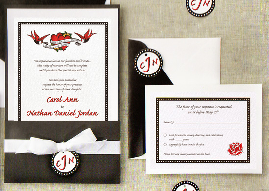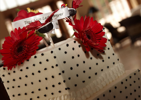 Being a designer, I just couldn't let my wedding be something off a retail store shelf or out of a catalog – it had to be my own unique expression of myself and my husband. We both love the tattoo and pin-up cultures and it's easy to see with the sailor-jerry inspired sparrow "logo" I created and polka dots I sprinkled throughout everything. I wanted to make the entire experience, from save the dates and invitations to décor to feel like one cohesive "brand" just like I do in my work every day – this is, in fact, my passion. I made the "logo", designed the invitations, crafted the cake topper, and carefully picked my polka dotted cake, gerbera daisies, color scheme, hairstyle – everything – even the oversized photobooth that featured out logo on the printouts.