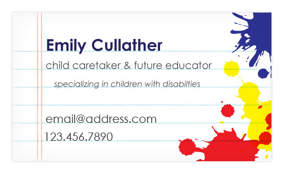 As my younger sister, Emily, entered her final years of school to become a Special Education Teacher, she asked me to make her a business card. She wanted hers to look different from other business cards she saw when she networked with others. I decided to play up the school theme with lined paper as the background. I used the paint splatters to highlight Emily's own creativity and uniqueness and I chose the primary colors to emphasize her interest in younger children without having to "spell it out".