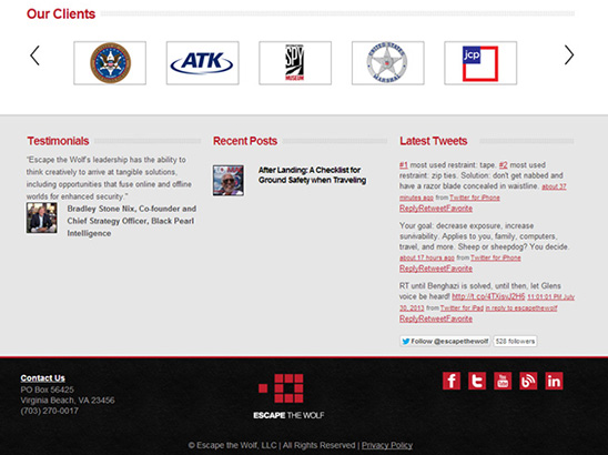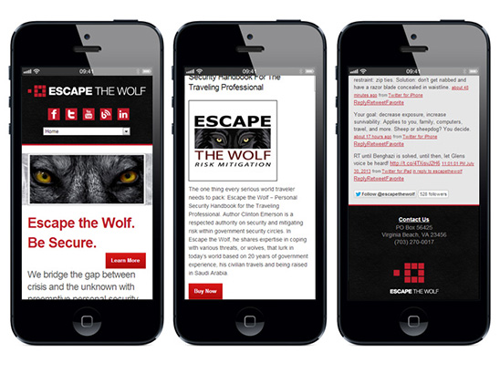 Escape the Wolf, a preemptive security and risk mitigation business, wanted to elevate their web presence by using the responsive web design, updating their look and feel, as well as integrating social media. By using a Wordpress CMS and preparing a custom user guide, we also allowed Escape the Wolf to confidently update and maintain their website moving forward.