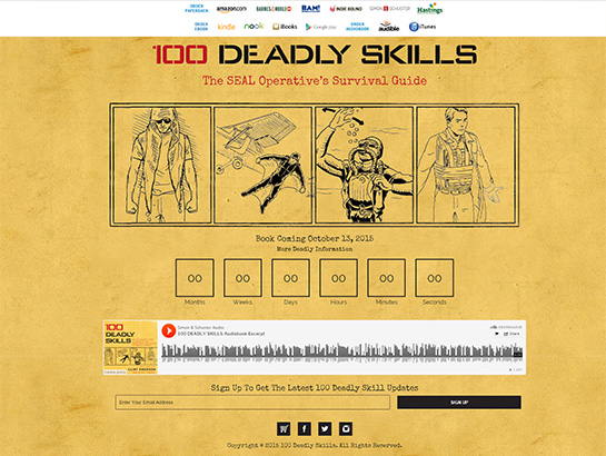 Using the Aktina WordPress Theme, I customized a splash page to help promote Clint Emerson's book, 100 Deadly Skills. The page currently features a book launch countdown, audiobook sample and newsletter signup but will evolve over time to include additional content such as videos.